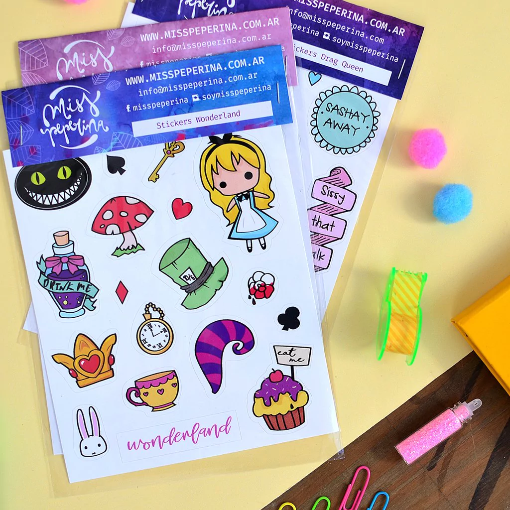 Stickers resistentes al agua para hacer journals, scrapbook o decorar lo que se te ocurra. Vienen de un país maravilloso, donde todo es posible, los animales hablan y la comida tiene efectos secundarios muy peligrosos.